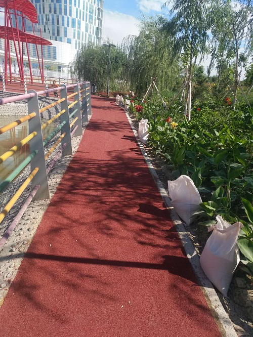 1.現(xiàn)在政府提倡城市綠化,道路美化工程也在逐漸增多,一些自行車道,健身步道和景區(qū)步道的彩色防滑路面做的很多,材料也是參差不齊,一般要滿足耐磨防滑,不易褪色,使用壽命長的功能,你可以咨詢鴻坤的彩色防滑路面材料,使用綠道樹脂上面撒是陶瓷顆粒施工,做出來的效果如下圖: